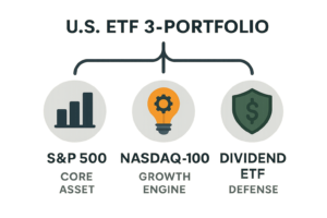 미국 ETF 3개 포트폴리오는 S&P500, 나스닥100, 배당 ETF만으로도 충분히 설계할 수 있습니다. S&P500은 코어 자산, 나스닥100은 성장 엔진, 배당 ETF는 방어와 현금흐름 역할을 맡습니다.